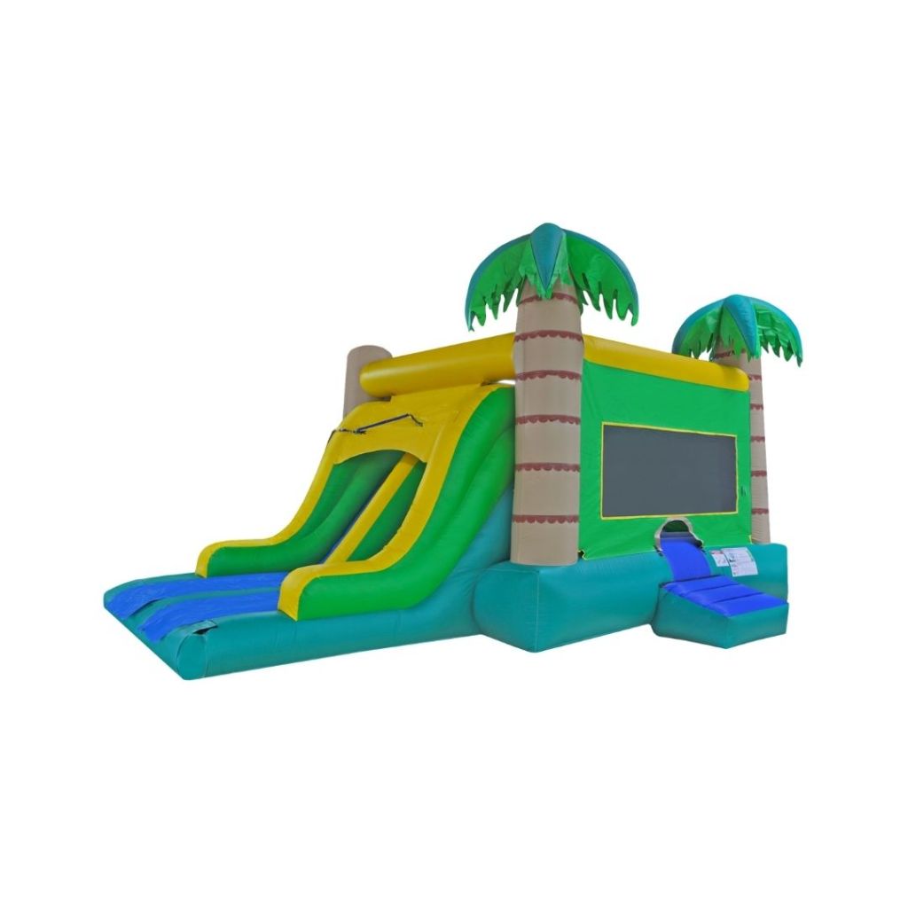 Introducing the Dual Slide Tropical Wet or Dry bouncy castle. This bouncy castle can be easily transformed into a dry combo by rolling up the pool area. Have a splash or simply bounce around, the choice is yours. It features a large 15′ x 15′ bounce area with a basketball as well as a double slide. This is guaranteed to keep the kids entertained for hours! Dimensions: 29’6″ x 15′ x 13′. Can accommodate up to 7 kids with a maximum weight limit of 150 lbs per person.