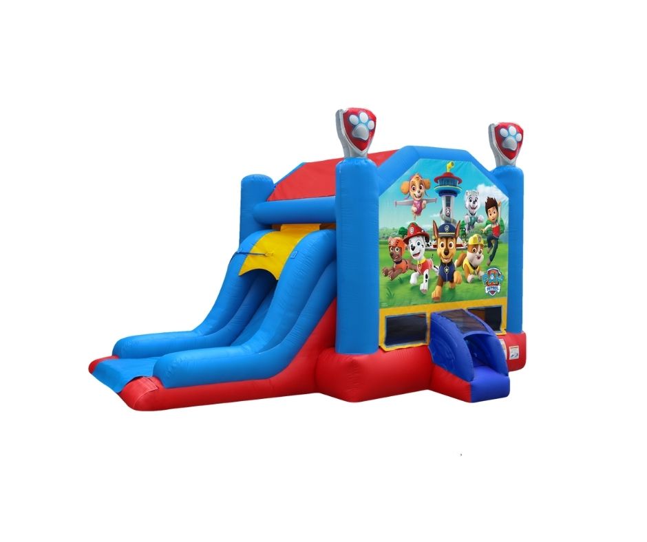 Roll with the pack with the Official PAW PATROL EZ Combo Wet or Dry. It is a bounce house water slide combo inflatable that features a special non-slip material that is for safe use with water. The PAW PATROL EZ Combo Wet or Dry can be used either as a dry inflatable combo by simply rolling up the pool and securing it with hook and loop fasteners included, or as a wet inflatable combo by rolling out the pool and filling it with water to make for a splashing good time during those hot days! Let up to 5 Adventure Bay legends bounce and cool off at the same time, play basketball, or climb and slide into the pool for a feel of a water park at the convenience of your own home. It’s a PAWsome & pup-tacular ride that is suitable for all occasions. The dimensions are 28′ x 14’6″ x 14′ with a maximum weight limit of 150lbs per child.